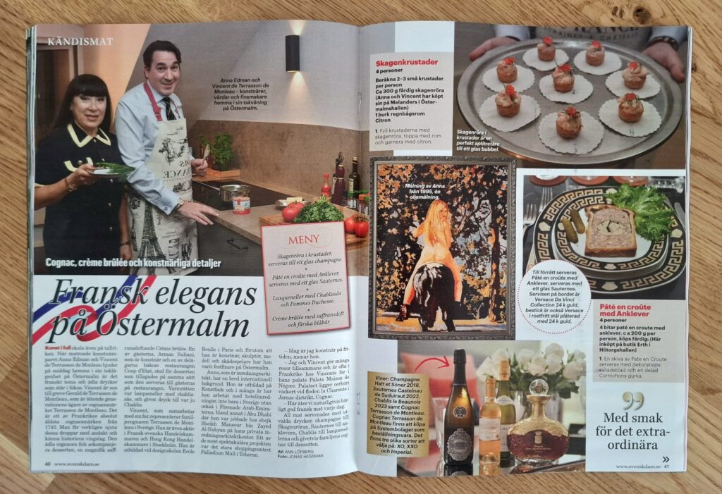 Lorsque Ann Edman et Vincent de Terrasson de Montleau invitent à dîner chez eux, dans leur magnifique appartement sur Östermalm, c’est le thème féminin et les saveurs nobles qui sont mis en avant. Vincent est le fils du Comte Gerald de Terrasson de Montleau, propriétaire de la huitième génération de la marque de cognac Terrasson Comte de Montleau.